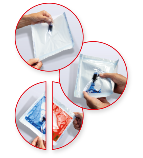 Für den Einsatz der InkTest MAX Einwegkartusche wird diese vollständig in den zu prüfenden Beutel eingeführt, eingeschweißt und anschließend aufgeknickt. Die 4 ml Prüfflüssigkeit verteilt sich gleichmäßig über alle vier Siegelnähte. Somit kann die Verpackungsintegrität vollständig und mit einem einzigen Arbeitsschritt geprüft werden.
